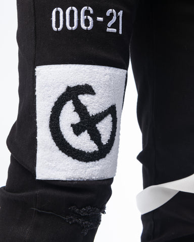 The Defender Denim features two tone combo, chenille patch embroidery, custom tactical leg taping, branded embroidery and printed hits, and slim fit tapering with added stretch.